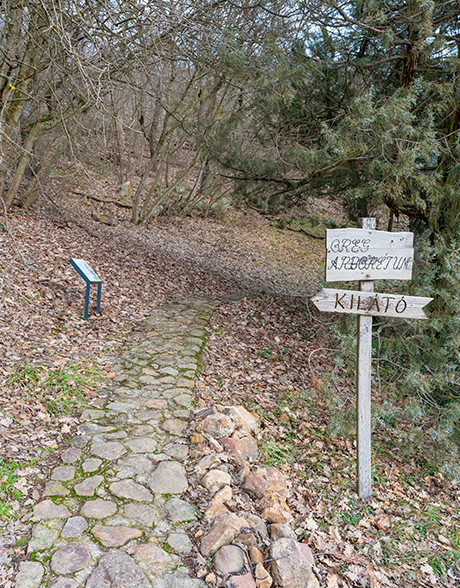 Térj be a táblánál az Öreg arborétumba. Az út idővel JOBBRA lefelé fordul. Figyelj a lépéseidre, mert a köves út meredek. A meredek domboldal alján, az úttól JOBBRA egy kivágott fatönköt találsz és mellette egy padot. Itt keresheted a hetedik QR kódot tartalmazó táblát!